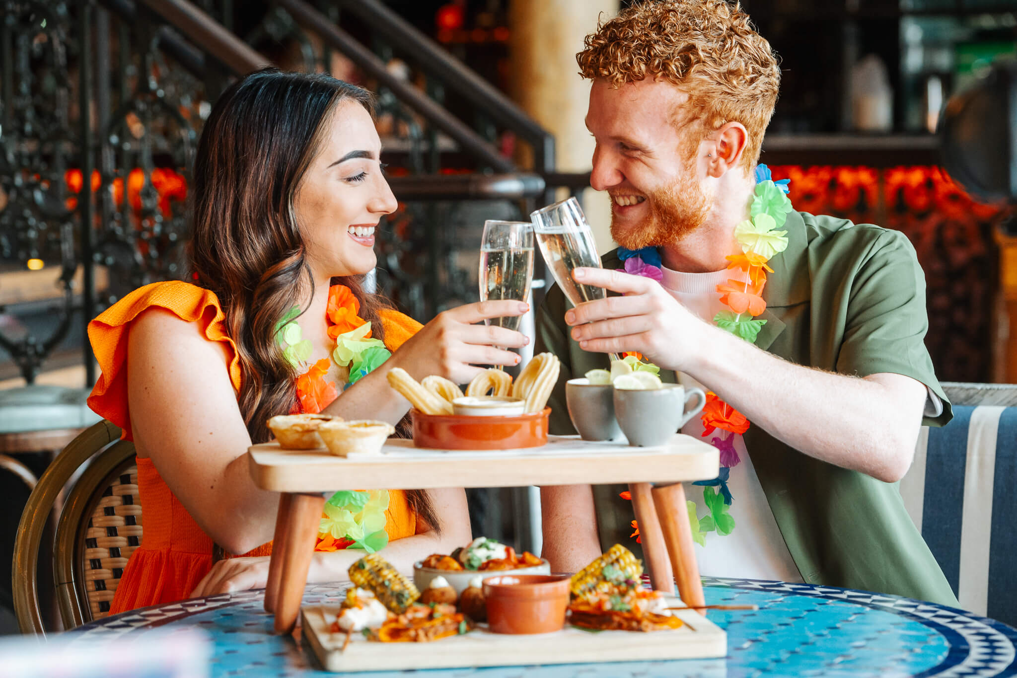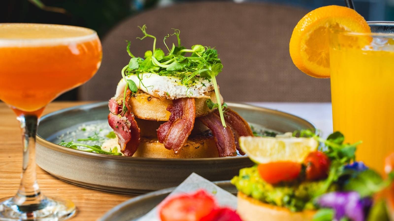 Start with a mimosa and salsa & chips, then dive into menu must-haves like the spicy fried chicken burger with jalapeños and rum mayo, or the indulgent churros + pancake stack loaded with sugar-dusted churros, strawberries, banana, and sticky rum caramel.
